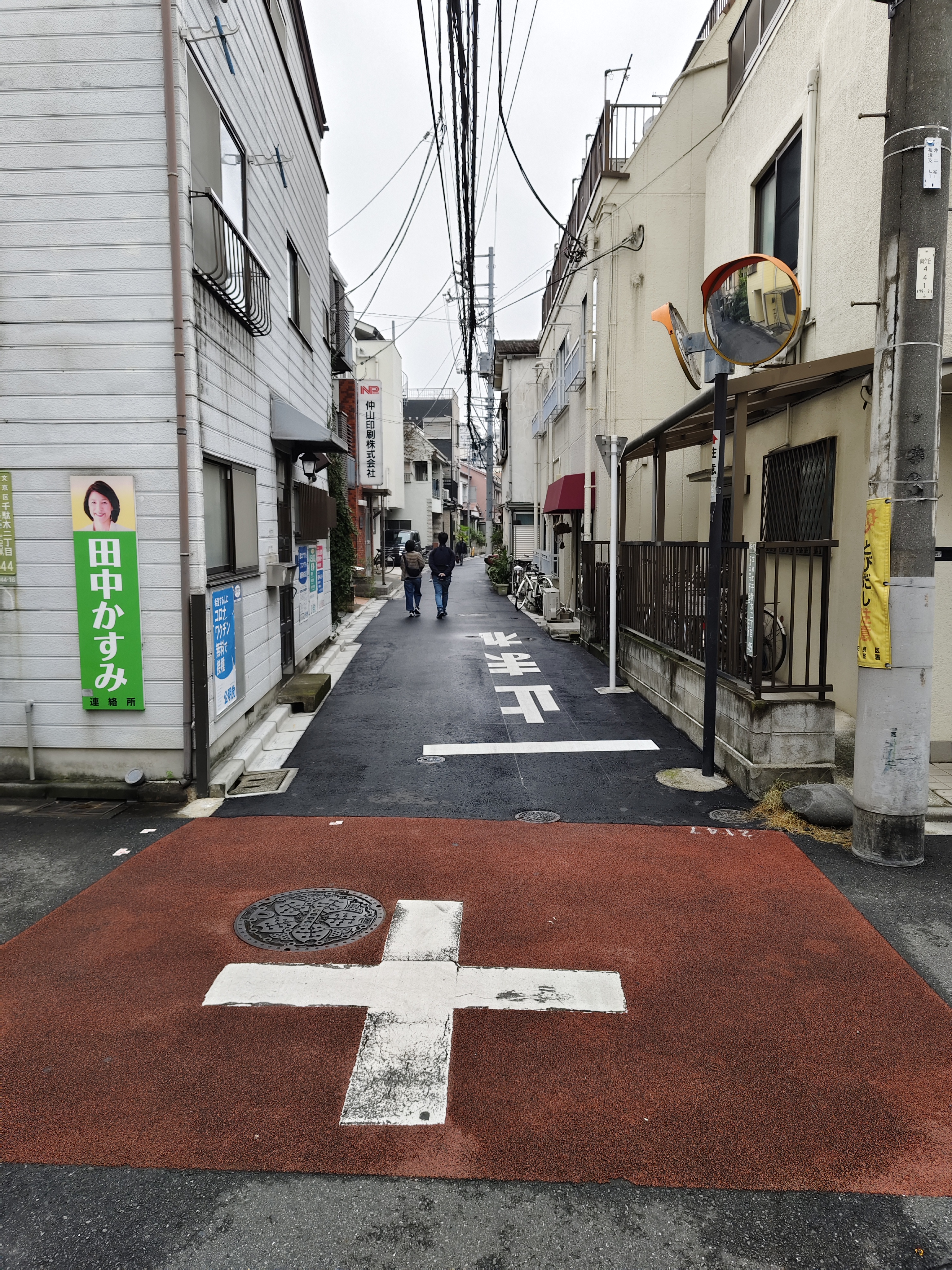 This is a pretty neighourhood but then all neighbourhoods are this pretty and orderly in Japan. But then where are the residents? You don't hear the usual neighbourhood buzz or the sounds of babies. The great mystery is the street macadam. It is kind of bouncy and the colour seems to change every now and then. You are not sure but they could be using some recycled material. Even these narrow streets are marked immaculately along with the green pedestrian path.